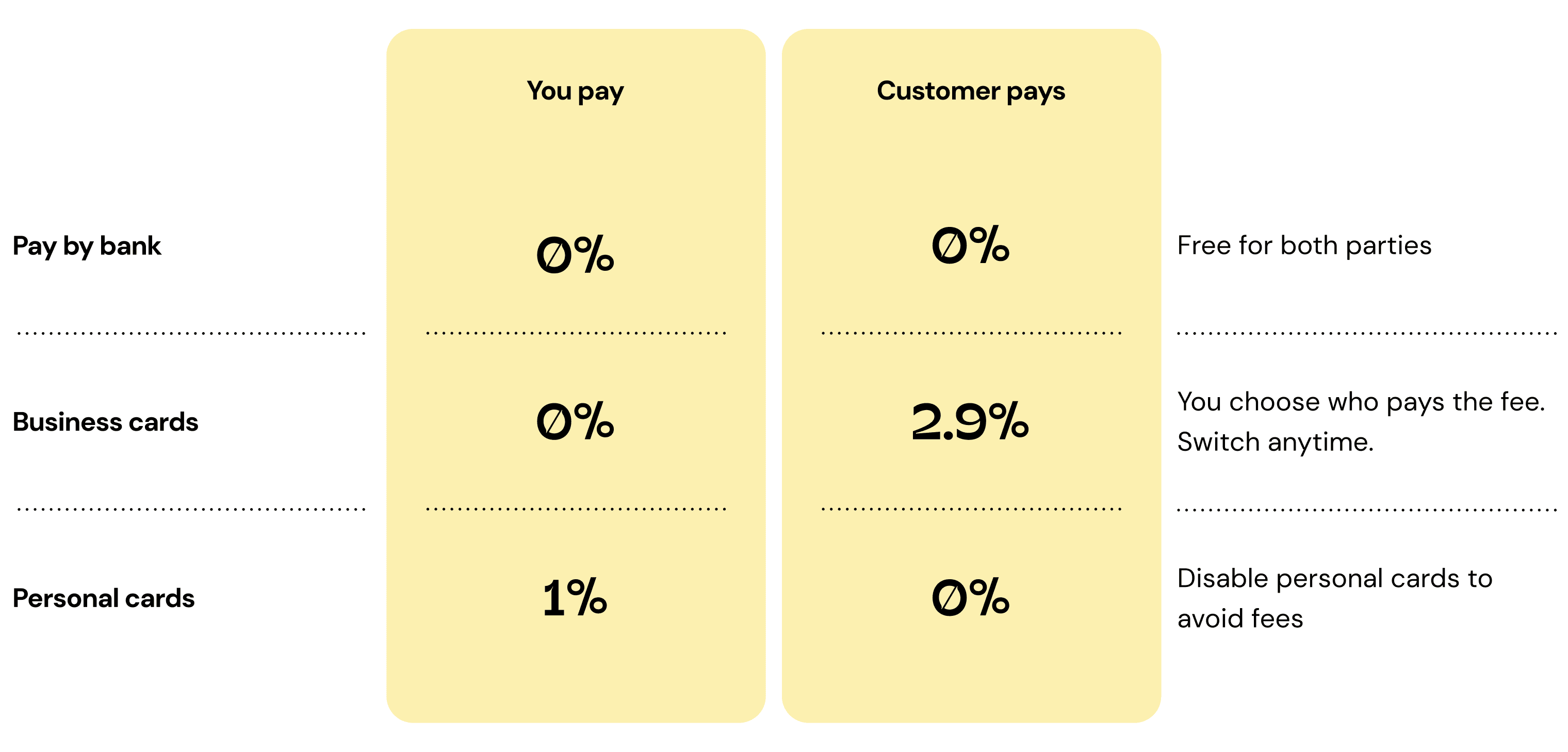 It’s free to pay by bank with Get paid. You also have the flexibility to choose which payment methods you accept, and who covers any fees. Here’s an overview of your options.