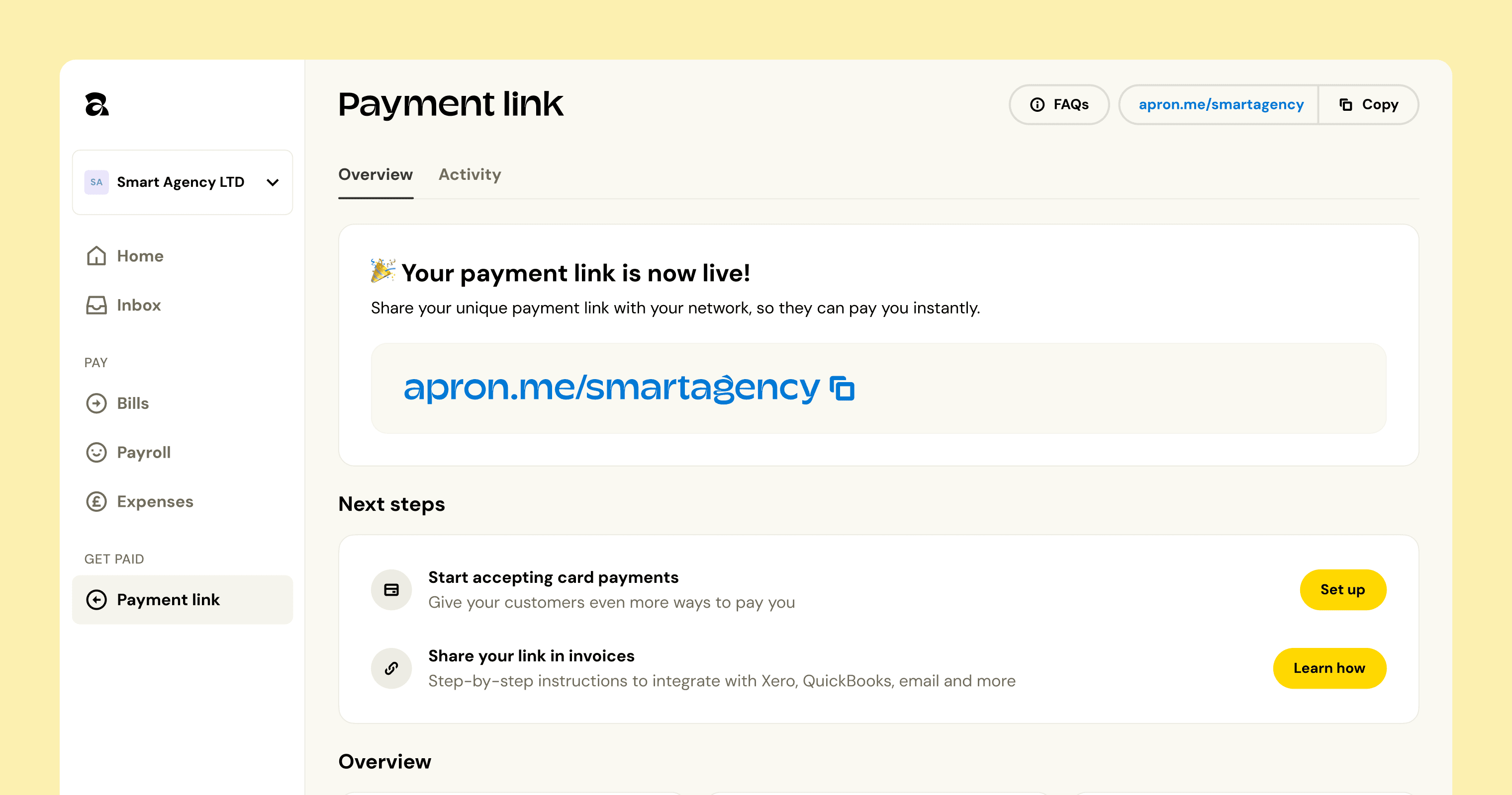 To find your unique Get paid link, simply click on ‘Payment link’ under ‘GET PAID’ on your Apron dashboard. Your Get paid link is shown under the Overview section.