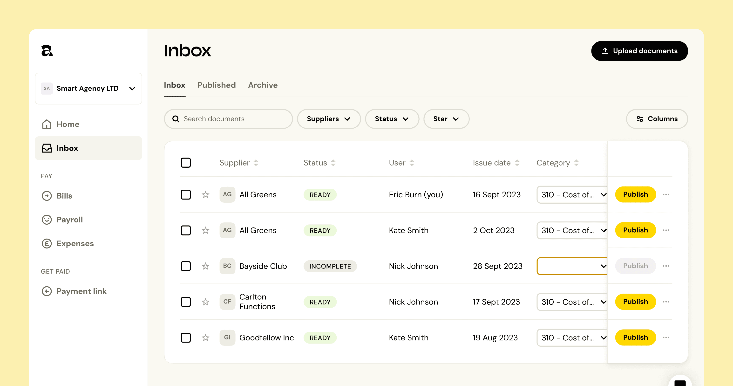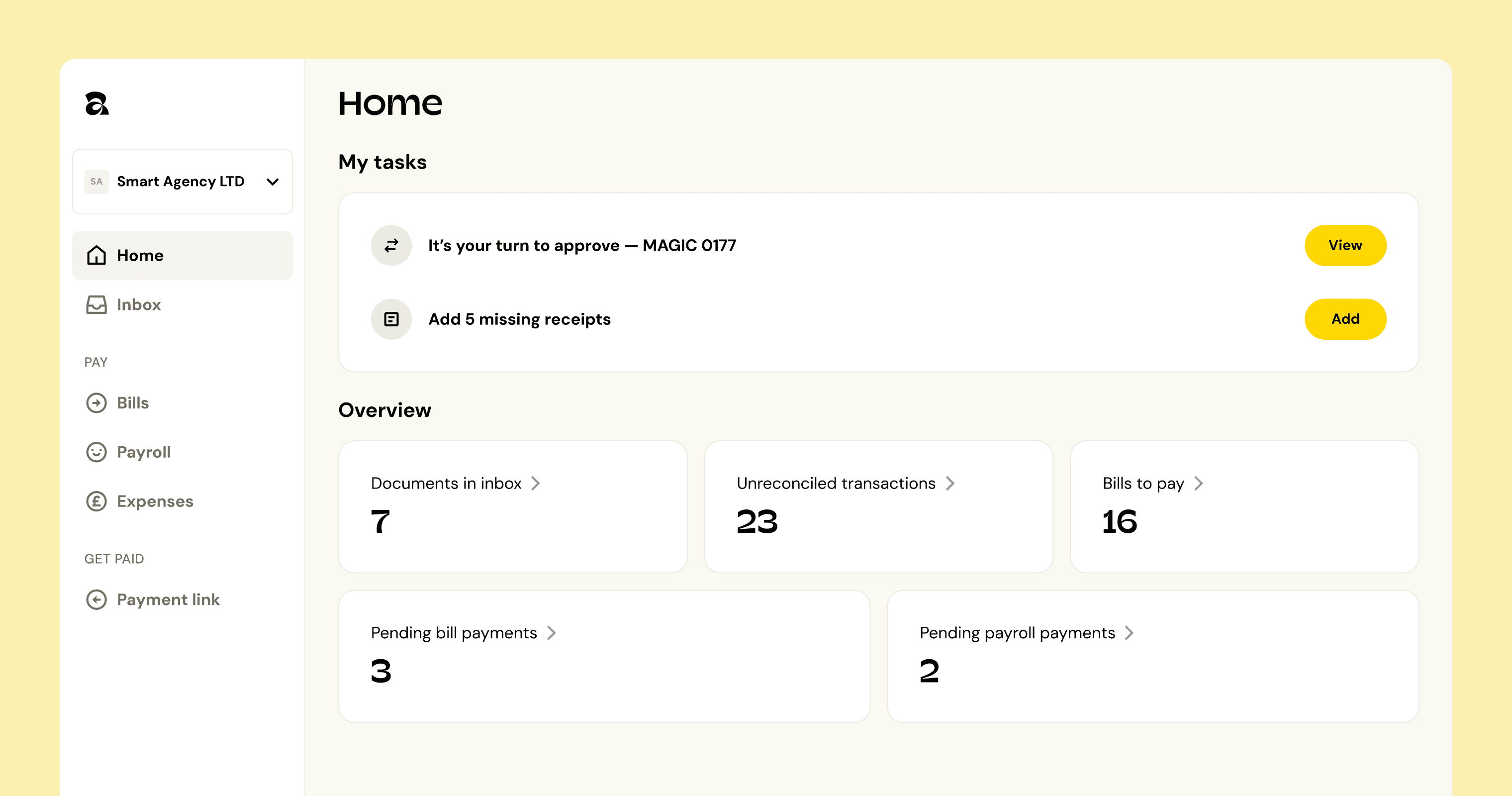 Speaking of Home, this tab now consolidates all tasks across both your bookkeeping and payments workflow. Your Home screen also provides an overview of your account, including how many documents you’ve got in your inbox, how many bills are due, and so on.