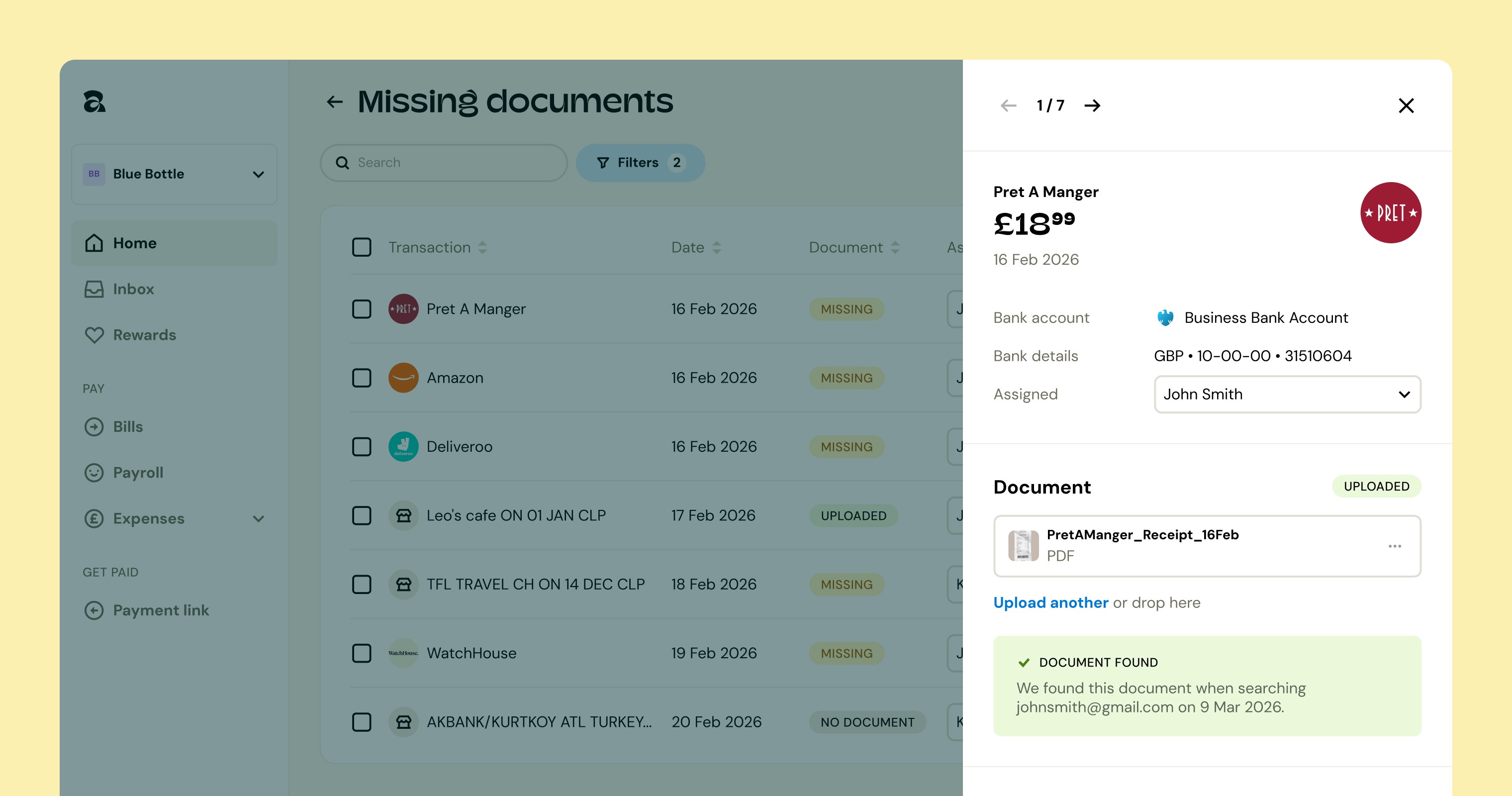 Apron minimises document chasing in the first place by bringing data capture, expenses, and payments together in one place.